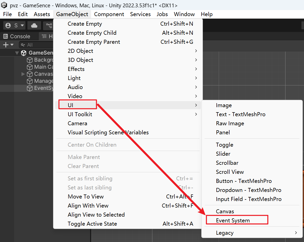 误删EventSystem导致按钮等功能无法交互首次创建ui控件的时候,系统会自动创建EventSystem,若不小心删除了,会导致按钮无法点击。解决方法为在GameObject菜单->UI->EventSystem直接创建即可